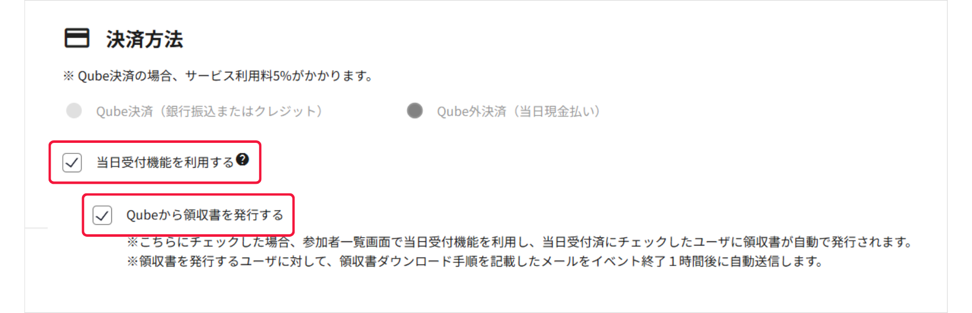 4.「当日受付機能を利用する」および、「Qubeから領収書を発行する」にチェックをしたら完了です。